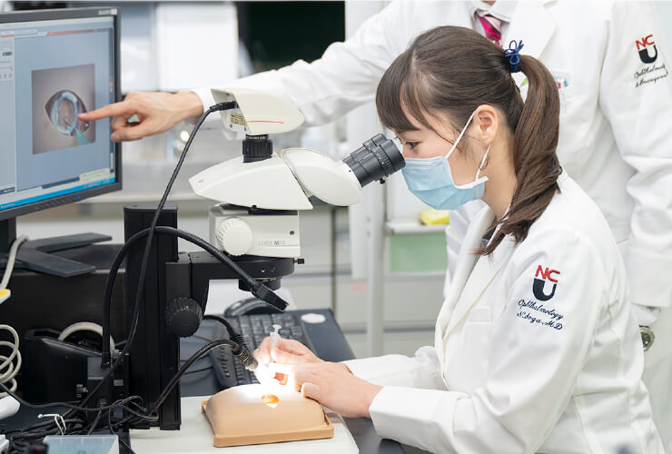 実際の手術機器、手術用顕微鏡を使い、手術トレーニングの実習を行っています。必ず上級医が指導する体制が整っています。机太郎を用いたDry Labでは、白内障手術の基本手技の練習を模型を使って練習します。