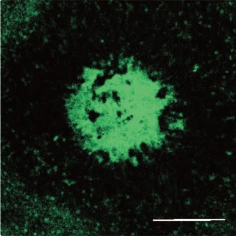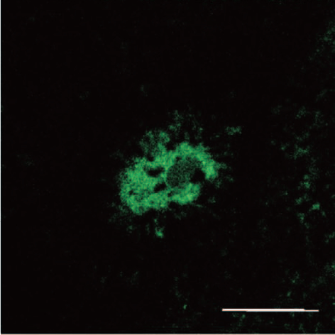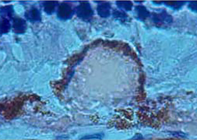 安川教授がドイツのライプチヒ大学留学中に開発した家兎リポフスチン蓄積モデルを用いて実験を行っています。リポフスチンは加齢とともにRPE細胞内に蓄積してくる顆粒状物質で、視細胞の光傷害を防ぐためRPEが視細胞外節を定常的に貪食処理している過程で生じる加齢性の副産物です。この加齢変化の蓄積が後に加齢黄斑変性発症に関与してくると考えられます。本モデルは、最終糖化産物(AGE: advanced glycation end products)からなるリポフスチン模擬微粒子を家兎の網膜下に注入し、RPE内へのリポフスチン蓄積を模倣させたもので、ドルーゼンや脈絡膜新生血管を発生することができます。また、加齢黄斑変性の前駆所見として注目されている異常眼底自発蛍光も人間の目と同様に観察できます。このモデルを利用し、アミロイドβ、アポE、補体H因子など主要な蛋白質の局在を免疫組織学的に検討し、AMDの病態に迫るべく研究を進めています。