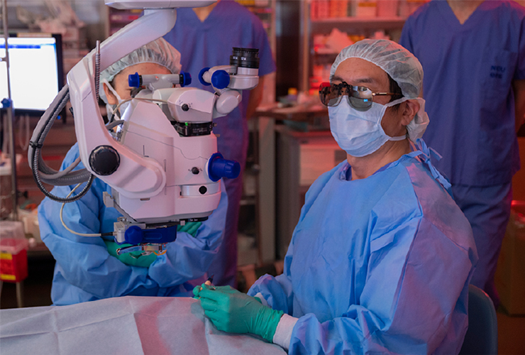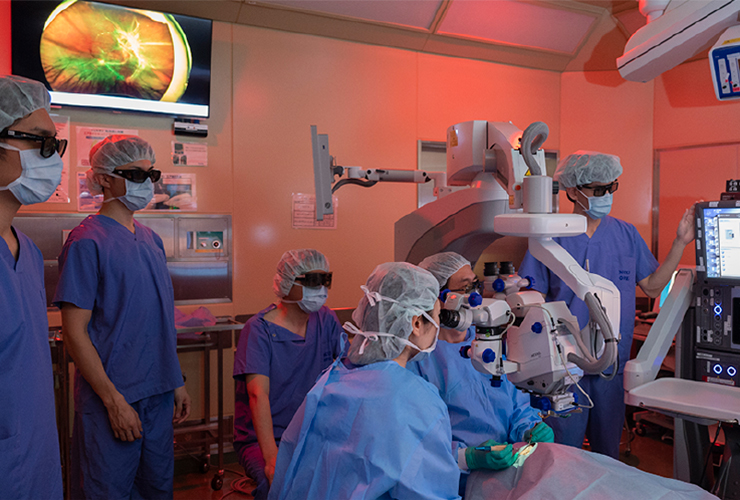手術の観察システムとしては、従来のアナログ顕微鏡のシステムに加え、3D Head up surgeryも導入しております。3D Heads up surgeryとは、顕微鏡の鏡筒をのぞくのではなく、カメラで撮影した映像を3Dテレビで見ながら手術を行うシステムです。映像のデジタル化により、光毒性や手術補助剤を軽減できるなどのメリットがあります。また、術者と同じ高精度で3Dの映像を助手や手術スタッフが共有できるため、一体感のある手術が可能であり、手術教育の効果も期待できます。このシステムを使い、低侵襲で高精度の手術を試みております。